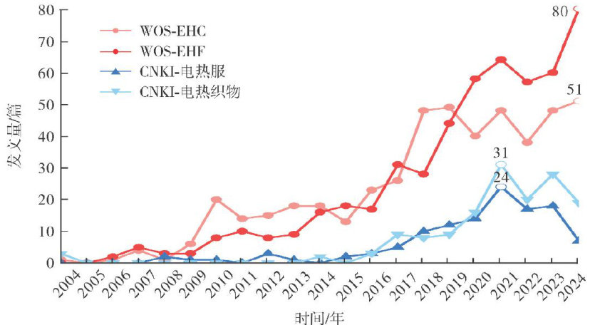 Abstract In order to study the current hotspots and future development trends of electric heating suits,this study searched the literature published between 2OoO and March 2O25 based on the China national knowledge infrastructure (CNKI) and web of science (WOS) databases. The visualization analysis was carred out by CiteSpace visualization tool for the annual publication volume,country of publication, institution of publication, keyword co-occurrence analysis,and keyword clustering. The results show that the research on electric heating apparel shows the evolution path of " material innovation-system integration-intelligent interaction". China dominates the research pattern with 56.39% of the total number of publications,and a large number of studies have been conducted by universities led by Tiangong university. The material system has gone through the iteration of silver-plated yarn/copper-based materials to carbon nanotubes,MXene,polypyrrole,with domestic researchers focusing on interfacial modification to realize precise temperature control, and international scholars focusing on breakthroughs in silver/carbon-based materials and exploration of medical-grade applications. In the future,the research on electrically heated clothing needs to integrate the advantages of foreign basic materials and domestic system integration experience,to overcome the problems of breathability,washing resistance,and the synergistic optimization of large-scale production,and to build a lightweight and adaptive intelligent thermal management system of "second skin of human body".