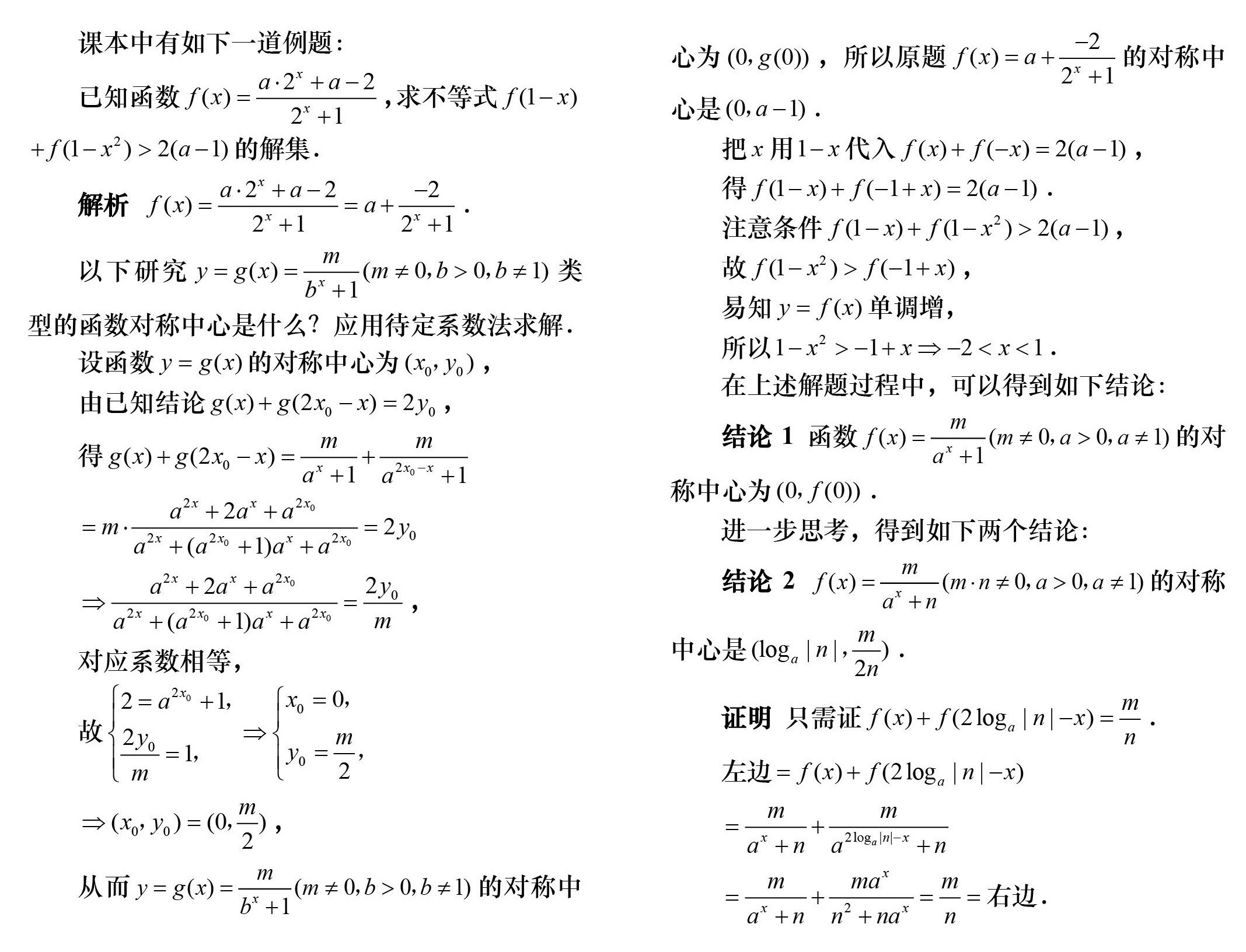 总之,在上述这一类复合函数的对称中心求解中,函数结构为“反比例函数”与“指数函数”的复合,这样的复(剩余49字)