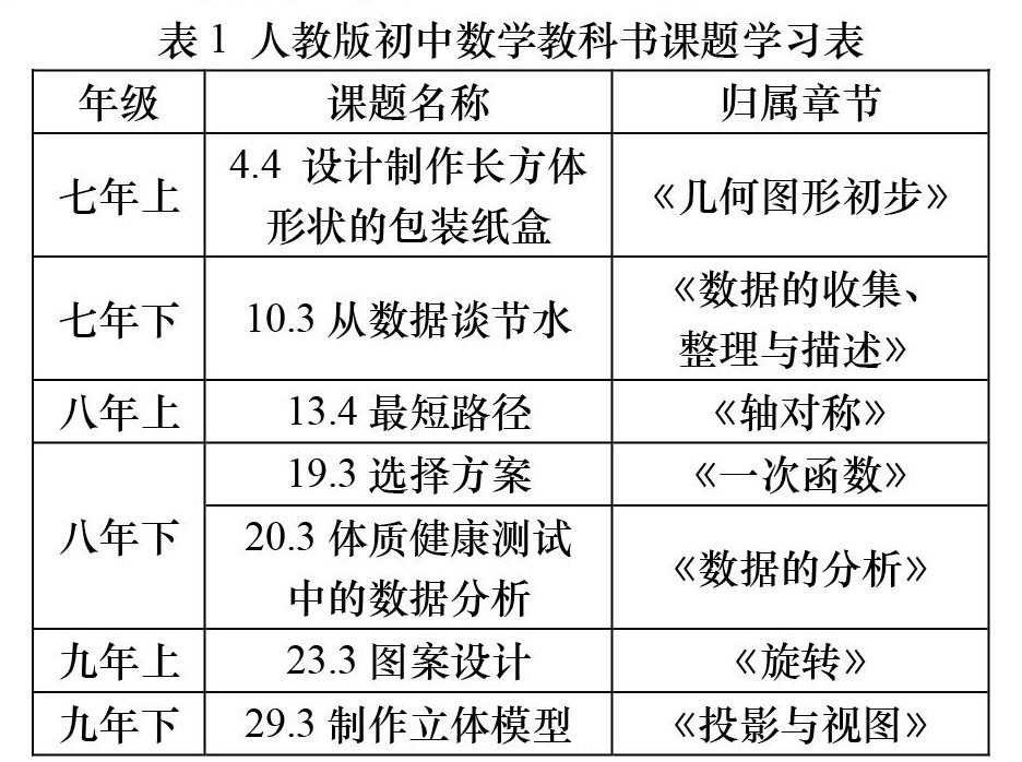 人教版初中数学教科书中共有七次课题学习(见表1).课题学习是着眼于学生在学习过程中的“数学问题解决”.通过适切的课题学习,学生的数学核心素养将会得到一定的培养.
