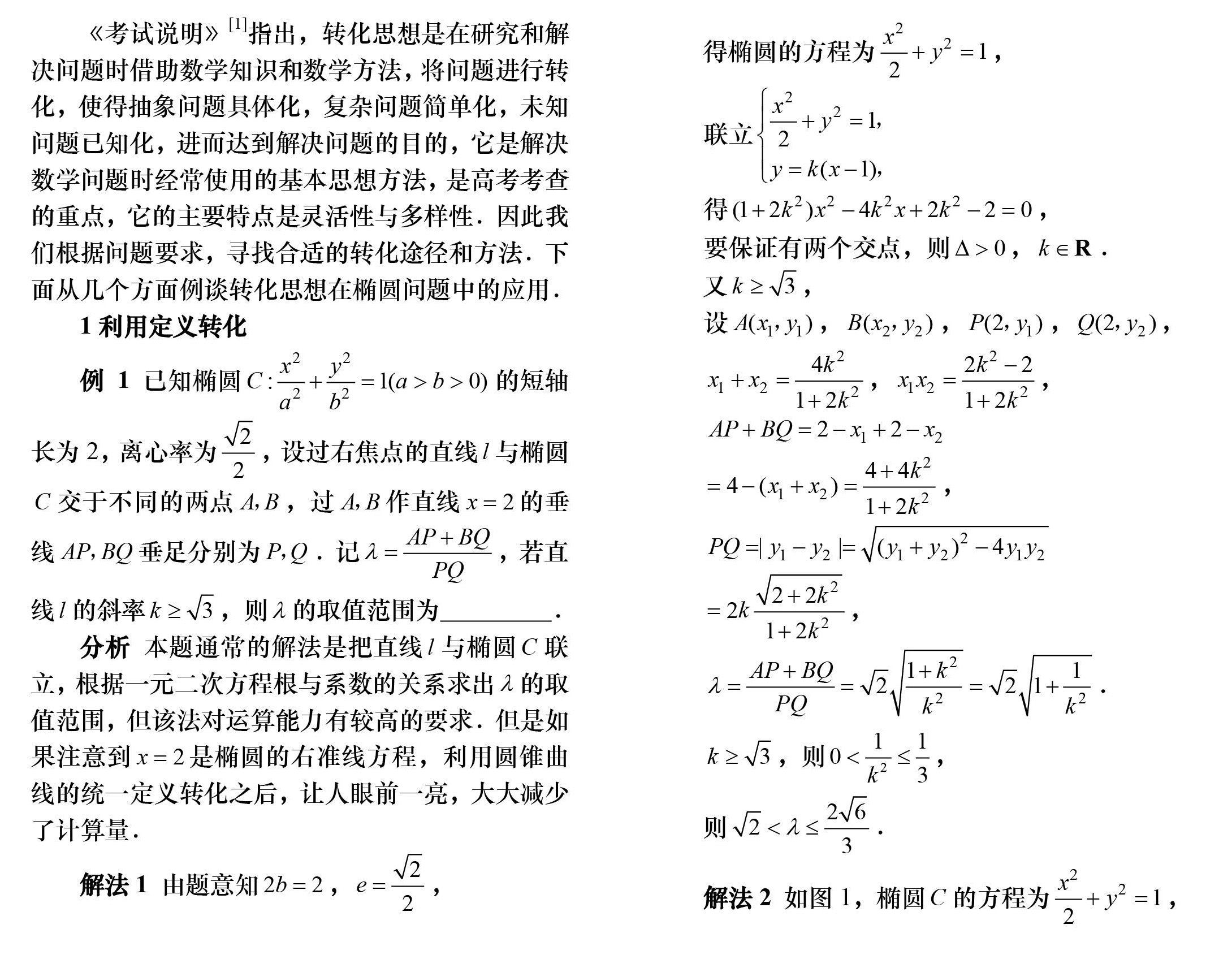 评析本题考查椭圆知识的综合应用,解题时要认真审题,注意挖掘题设中的隐含条件,合理进行转化是解题的关键,以上两种转化方法都可以解决本题,但是解法2更简便,