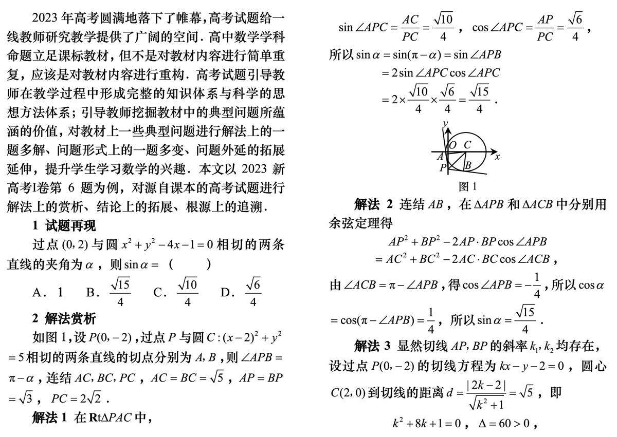 2023年高考圆满地落下了帷幕,高考试题给一线教师研究教学提供了广阔的空间,高中数学学科命题立足课标教材,但不是对教材内容进行简单重复,应该是对教材内容进行重构.高考试题引导教师在教学过程中形成完整的知识体系与科学的思想方法体系;引导教师挖掘教材中的典型问题所蕴涵的价值,对教材上一些典型问题进行解法(剩余91字)