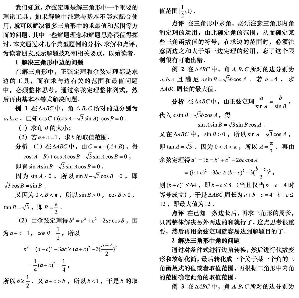 我们知道,余弦定理是解三角形中一个重要的理论工具,如果解题中注意与基本不等式配合使用,就可以解决很多三角形中的求最值和范围等方面的(剩余65字)