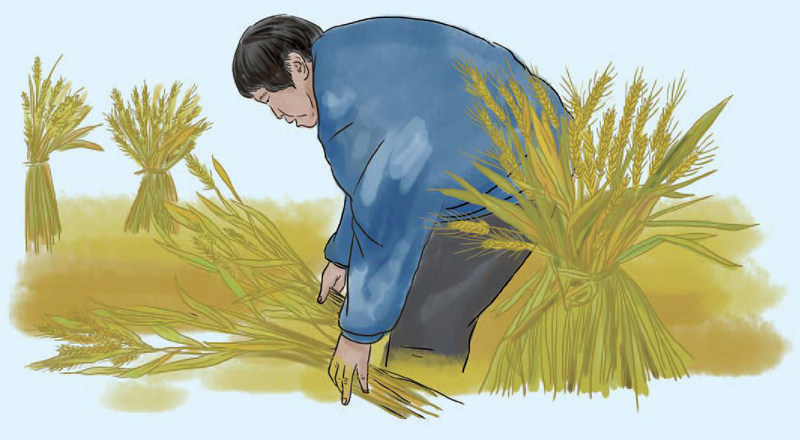 风吹着麦子,飘出咸咸的麦香。奶奶穿着一件蓝布褂,手持镰刀,一拢一拢地割着。那淡蓝的身形,一点一点隐入夕阳中……