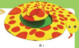 1.准备一张黄色硬卡纸,剪出一条盘旋状的小蛇,在蛇身画上精美的花纹。将蛇尾捏成一个圆锥形,方便悬挂,如图1。