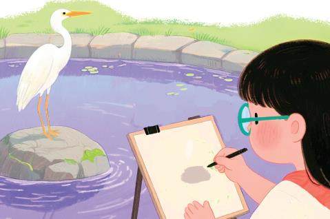 何曼曼心中早就有了主意—— 她要画一只水鸟。她记得上次来公园时,见过一只水鸟站在池塘中央的石头上,时而低头觅食,时而轻轻振翅,姿态优雅极了。