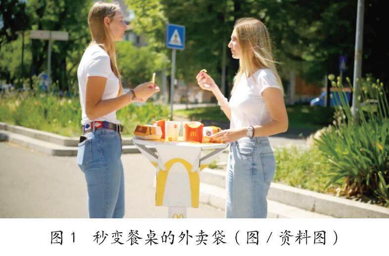 使用这个长方体的外卖袋时,只需将其底部套进柱子固定,按折线将包装袋标记打开并折叠平整即可。桌面足够宽敞,中心位置还有两个饮料固定架,可容纳两个汉堡和两份薯条,以及两杯饮料。