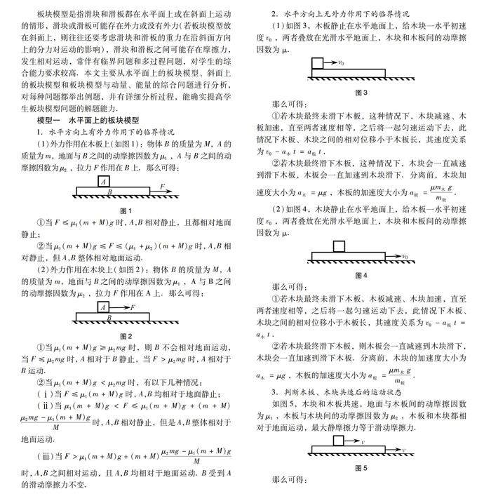 板块模型是指滑块和滑板都在水平面上或在斜面上运动的情形,滑块或滑板可能存在外力或没有外力(若板块模型放在斜面上,则往往还要考虑滑块和滑板的重力在沿斜面方向上的分力对运动的影响),滑块和滑板之间可能存在摩擦力,发生相对运动,常伴有临界问题和多过程问题,对学生的综合能力要求较高.本文主要从水平面上的板块(剩余8458字)