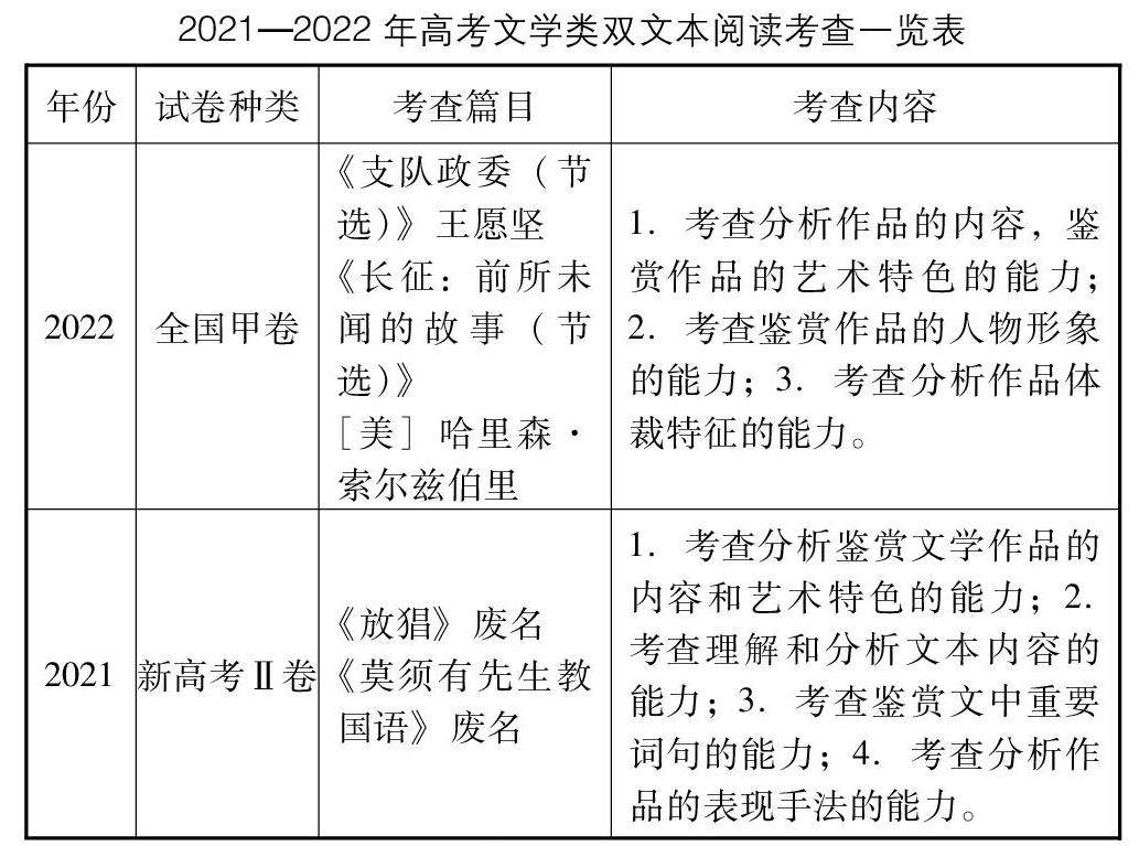 文学类文本阅读是多年来高考语文的必考题。传统的文学类文本阅读命题,都是选择一个阅读材料,或小说,或散文,从内容、情感、手法等角度设置题目,这样的阅读材料称为单文本阅读模式。随着高考评价体系的进一步完善,高考内容和考查形式的变革在所难免。2021年新高考Ⅱ卷,文学类文本阅读首次突破了以往单文本阅读模式,阅读材料变为由两个文本组成,分别称之为“文本一”和“文本二”,这种呈现材料的形式就是双文本,是一种全新的命题形式。(剩余7245字)