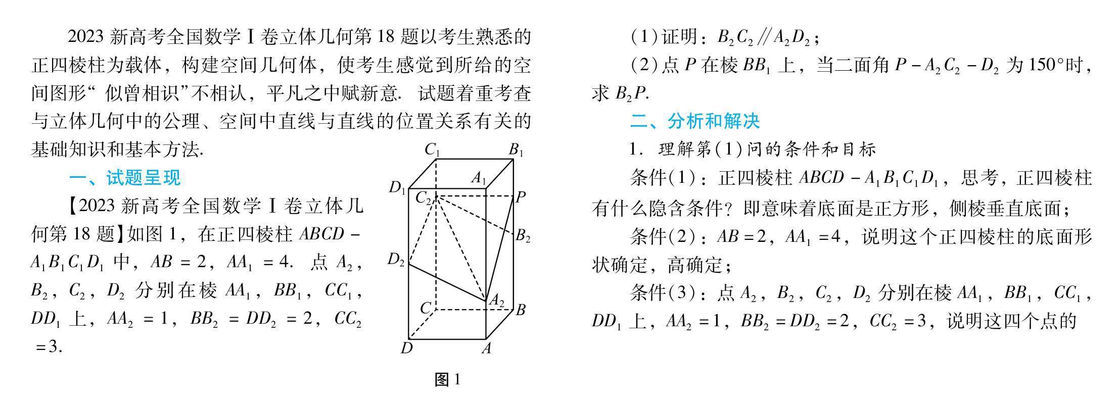 2023新高考全国数学Ⅰ卷立体几何第18题以考生熟悉的正四棱柱为载体,构建空间几何体,使考生感觉到所给的空间图形“ 似曾相识”不相认,平凡之中赋新意.试题着重考查与立体几何中的公理、空间中直线与直线的位置关系有关的基础知识和基本方法.