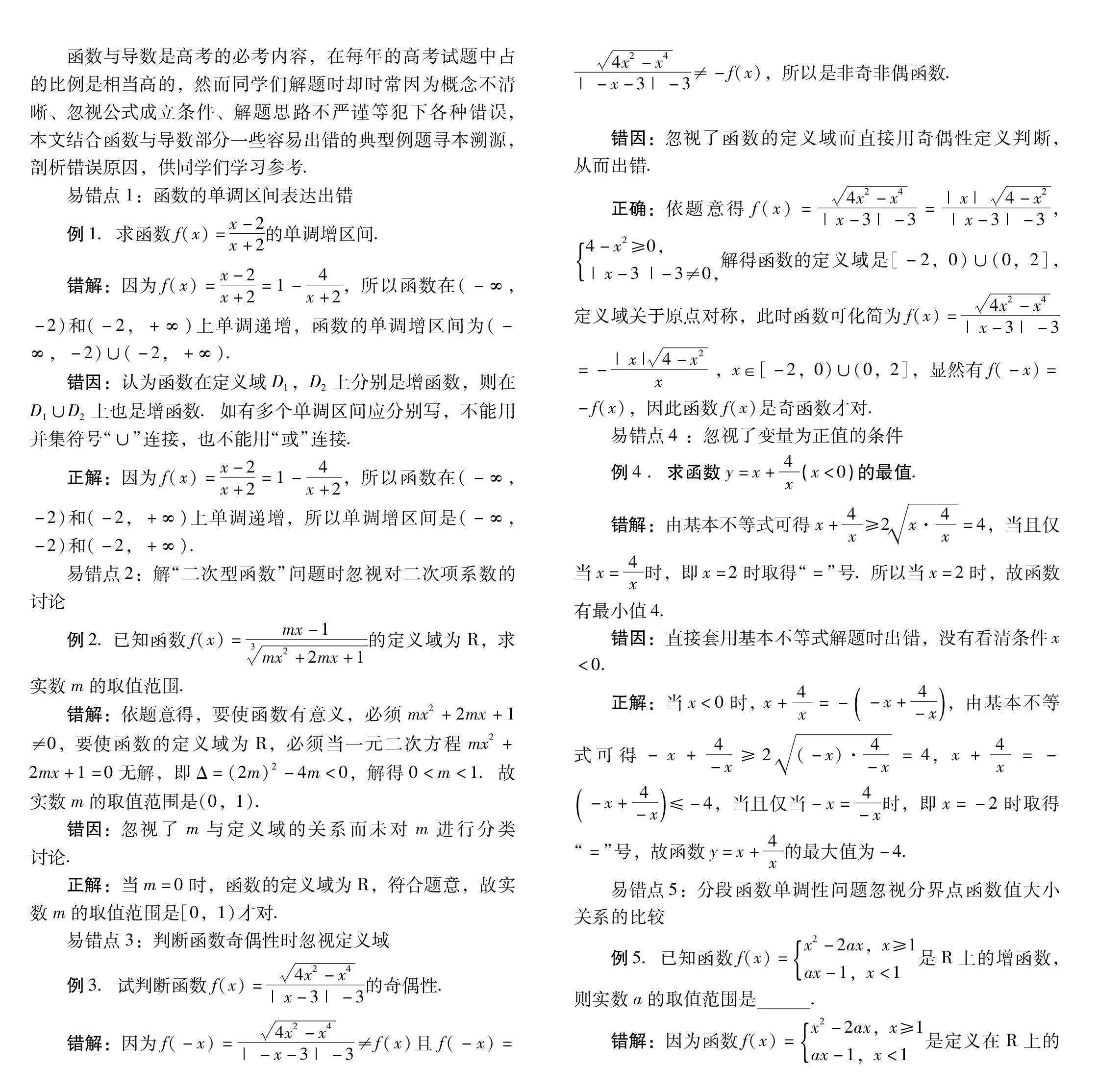 函数与导数是高考的必考内容,在每年的高考试题中占的比例是相当高的,然而同学们解题时却时常因为概念不清晰、忽视公式成立条件、解题思路不严谨等犯下各种错误,本文结合函数与导数部分一些容易出错的典型例题寻本溯源,剖析错误原因,供同学们学习参考.