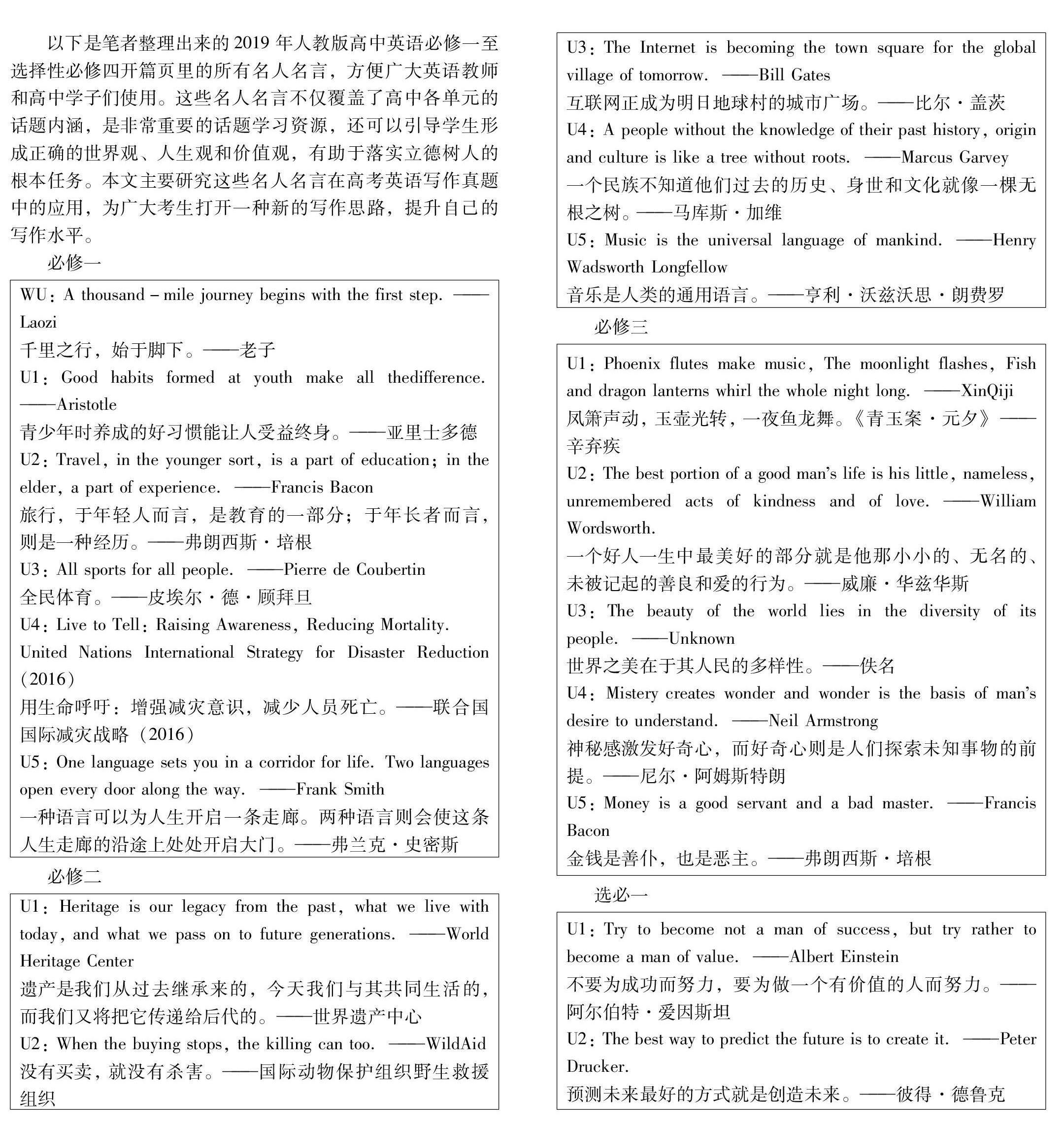以下是笔者整理出来的2019年人教版高中英语必修一至选择性必修四开篇页里的所有名人名言,方便广大英语教师和高中学子们使用。这些名人名言不仅覆盖了高中各单元的话题内涵,是非常重要的话题学习资源,还可以引导学生形成正确的世界观、人生观和价值观,有助于落实立德树人的根本任务。本文主要研究这些名人名言在高考英语写作真题中的应用,为广大考生打开一种新的写作思路,提升自己的写作水平。(剩余7885字)