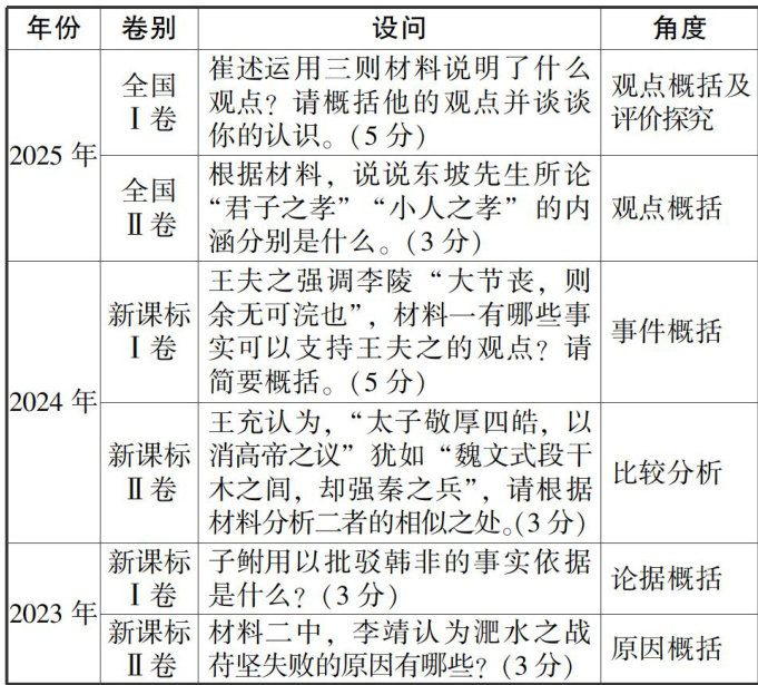 自2023年起,文言文阅读呈现三大变化:一是文本由单则材料转为多则材料组合;二是选材范围突破传统史传类作品的局限,拓展至诸子典籍、杂史小说等多元领域;三是材料组合强调内在关联,注重思维与逻辑的有机融合。(剩余4344字)