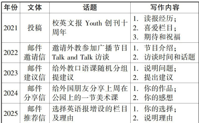 从上表可看出近五年新高考全国I卷的应用文写作基本沿用以写邮件的情境方式展开,话题贴近学生的校园生活,从2022年开始只提供2个写作内容要点,体现其开放性。(剩余6288字)