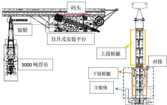 Abstract: Due to the excessive length of the spud legs oftheself-elevating installtion platform,it is impossible to complete the dockingand installationof the spud legs inthedock.Therefore,the process is divided into thelower spud leg docking inthe dock and the upper spud leg docking at the wharf.Based on the analysis of the docking and installation processflow,this paper conducts a multi-ship coupled hydrodynamic analysis during the floating state docking ofthe spud legs ofthe self-elevating platform.The results show thatthe lifted spud leg section significantly increases the motion of the floating crane vessel and the platform. Under the given wind,wave and current environment, the vertical safe distance between the lifted spud leg section and the platform is 2m ,which can provide support for the safe construction of the self-elevating installation platform.