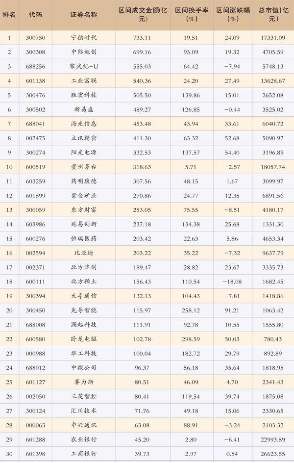 本统计期内(9月1日-9月24日),陆股通前10大活跃股包括宁德时代(300750)、中际旭创(300308)、寒武纪-U(688256)、工业富联(601138)、胜宏科技(300476)、新易盛(300502)、海光信息(688041)、立讯精密(002475)、阳光电源(300274)、贵州茅台(600519)。(剩余1628字)