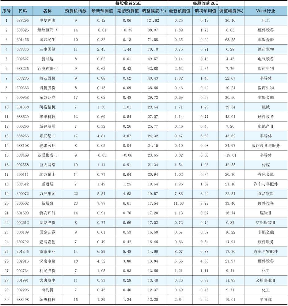 本数据系在近1个月内,调整幅度大于10%、预测机构数大于7家、一致预期不断调高的股票,排名按2025年调整幅度由高到低。(剩余12字)