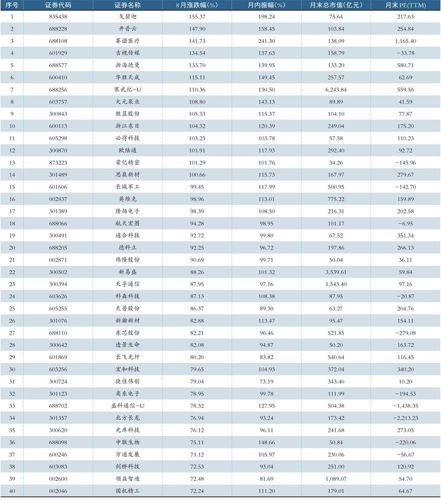 2025年8月A股涨幅前40只股票(剔除年内新股)