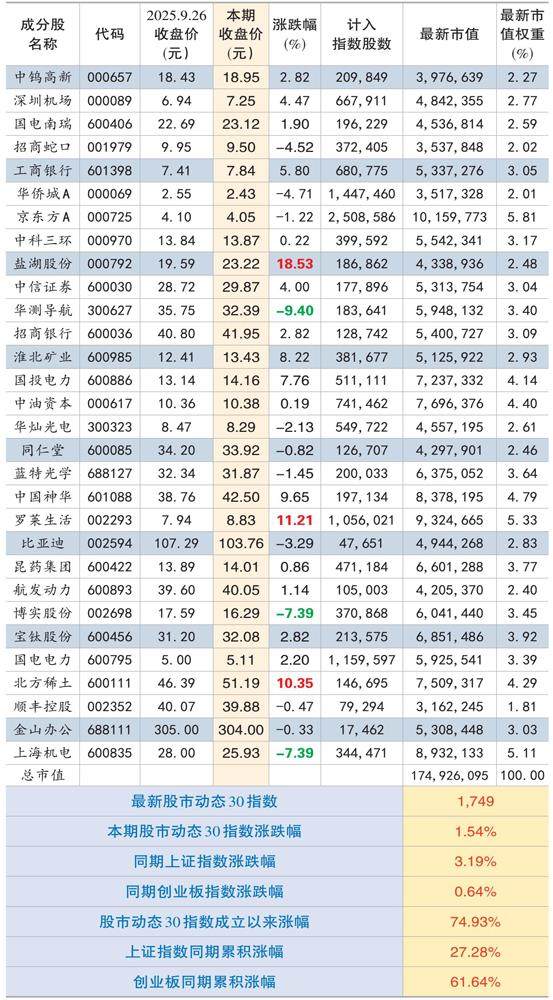 本期股市动态30指数收于1749点,较上期上涨1.54%,同期上证指数上涨3.19%,创业板指数上涨0.64%。成分股中,盐湖股份、罗莱生活和北方稀土等个股涨幅靠前,华测导航、上海机电和博实股份等涨幅靠后。