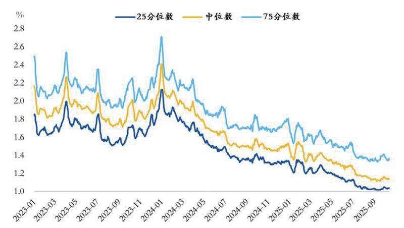 今年9月,货基月均收益率约1.15%,相比今年6月下降0.17bp,货基的7日年化收益率的25%分位数也降至1.04%。如果从季报数据观察,今年以来全部货基收益率均位于2%以下,货基数量占比最高的收益区间已连续两个季度左移,今年二季度末降至1.0%-1.2%。(剩余2272字)