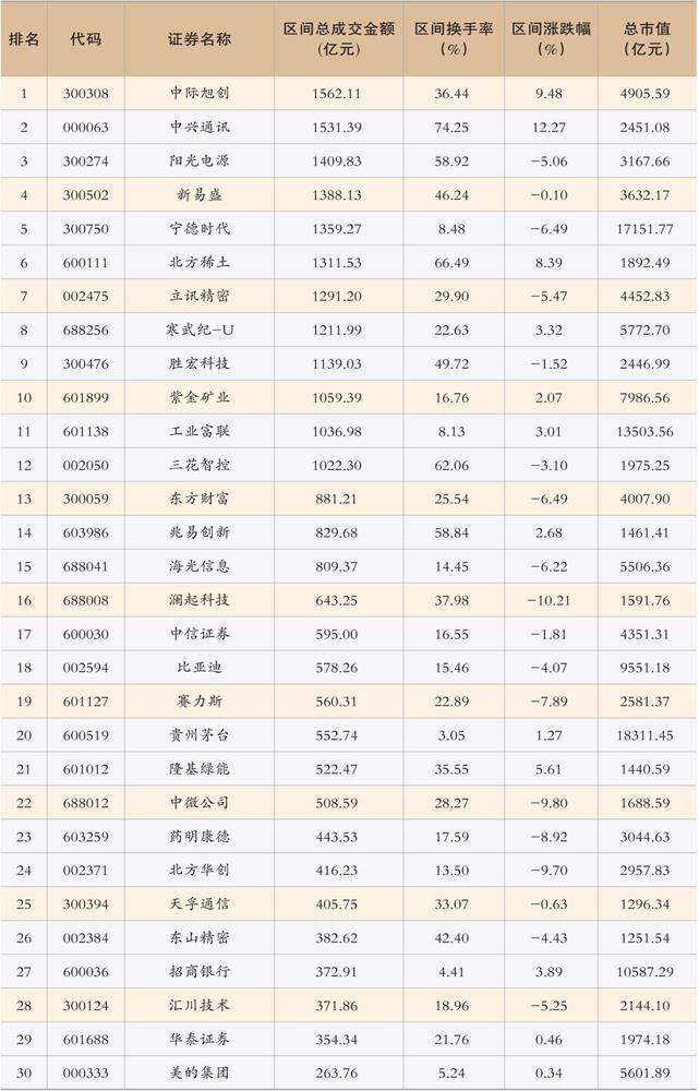 本统计期内(10月1日-10月21日),陆股通前30大活跃股包括中际旭创(300308)、中兴通讯(000063)、阳光电源(300274)、新易盛(300502)、宁德时代(300750)、北方稀土(600111)、立讯精密(002475)、寒武纪-U(688256)、胜宏科技(300476)、紫金矿业(601899)等。(剩余1626字)