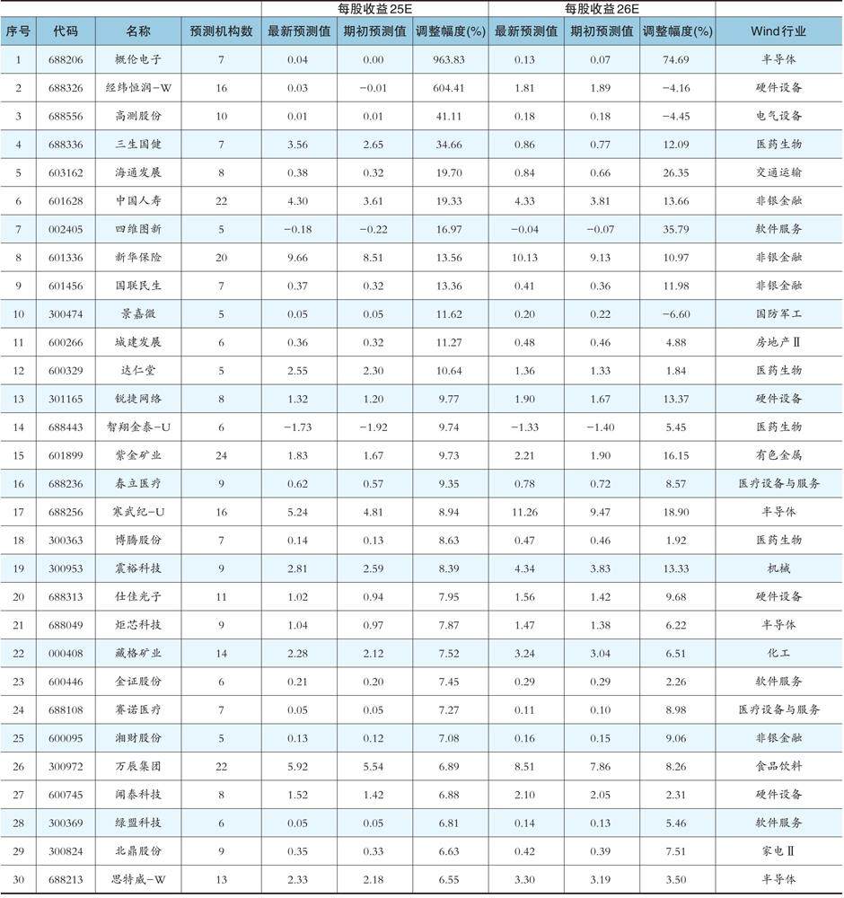 *本数据系在近1 个月内,调整幅度大于5%、预测机构数大于5 家、一致预期不断调高的股票,排名按2025 年调整幅度由高到低。(剩余14字)