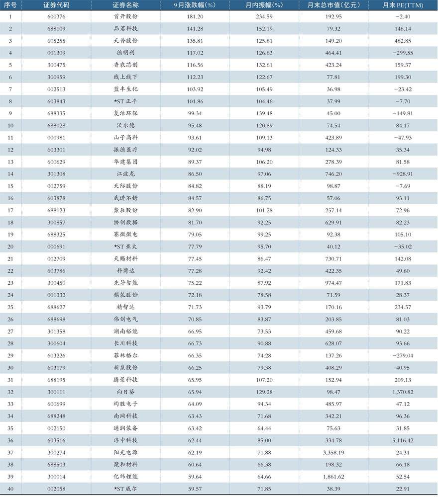 2025年9月A股涨幅前40只股票(剔除年内新股)