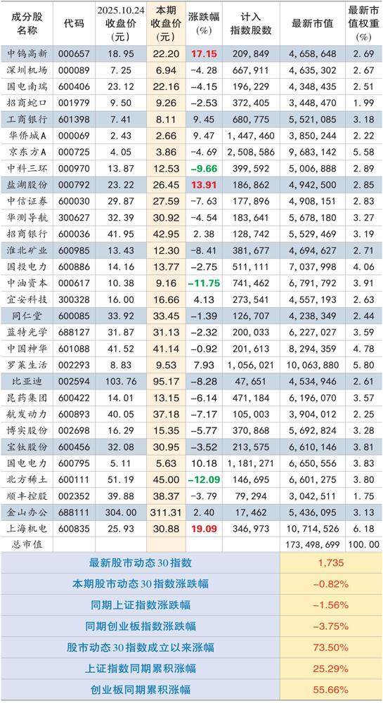 本期股市动态30指数收于1735点,较上期下跌0.28%,同期上证指数下跌1.56%,创业板指数下跌3.75%。成分股中,上海机电、中钨高新、盐湖股份等个股涨幅靠前,北方稀土、中油资本和中科三环等涨幅靠后。