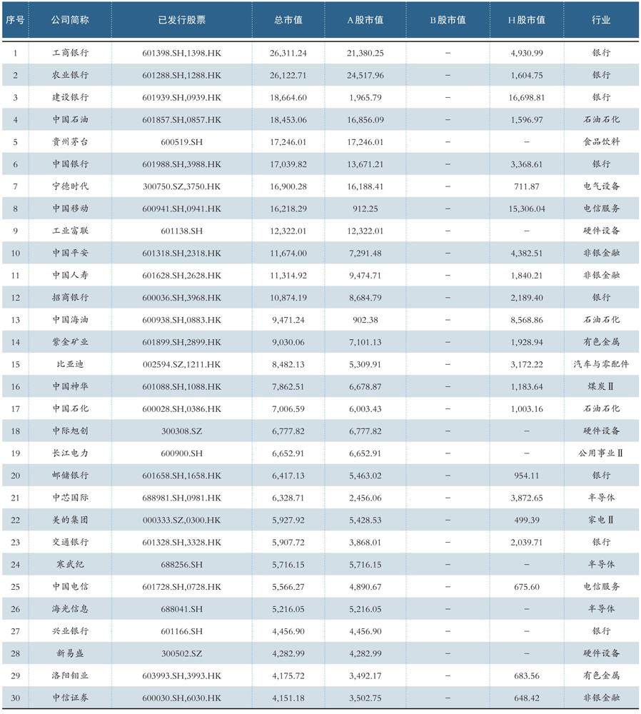 2025年12月底总市值前30家公司(亿元,CNY)