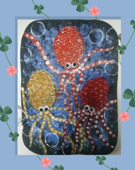 3. 将椭圆形的防撞泡泡塑料粘在卡纸上,涂上不同的颜色并画上章鱼的腕足。(剩余378字)