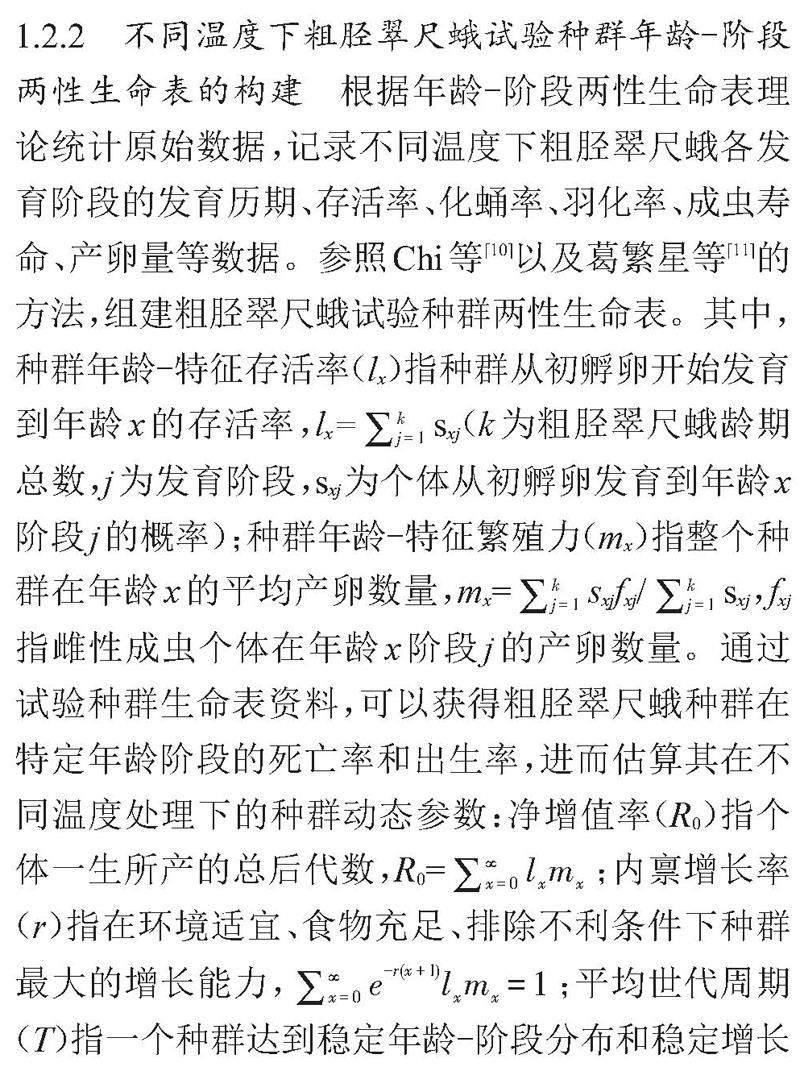 摘 要:【目的】明确温度对粗胫翠尺蛾各虫态存活率、发育历期以及繁殖力的影响,为准确预测粗胫翠尺蛾发生期及提高田间防控效果提供参考依据。【方法】采用室内人工恒温饲养的方法,以荔枝嫩梢为寄主,利用年龄-阶段两性生命表,测定20、23、26、29、32 ℃ 5个温度下粗胫翠尺蛾各虫态发育历期、存活率、成虫寿命及繁殖力,对其发育速率与温度的相关性进行回归分析,计算各虫态发育起点温度和有效积温。(剩余22031字)