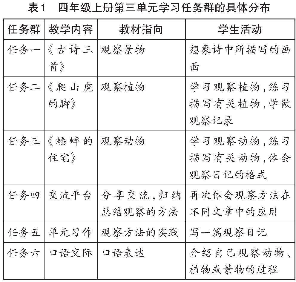【摘要】本文以小学语文四年级上册第三单元“观察”主题为例,建议教师将教科书的内容和课标提出的学习任务群关联起来,使人文主题情境化、单元要素任务化、习作教学任务细致化,降低单元习作任务的难度。