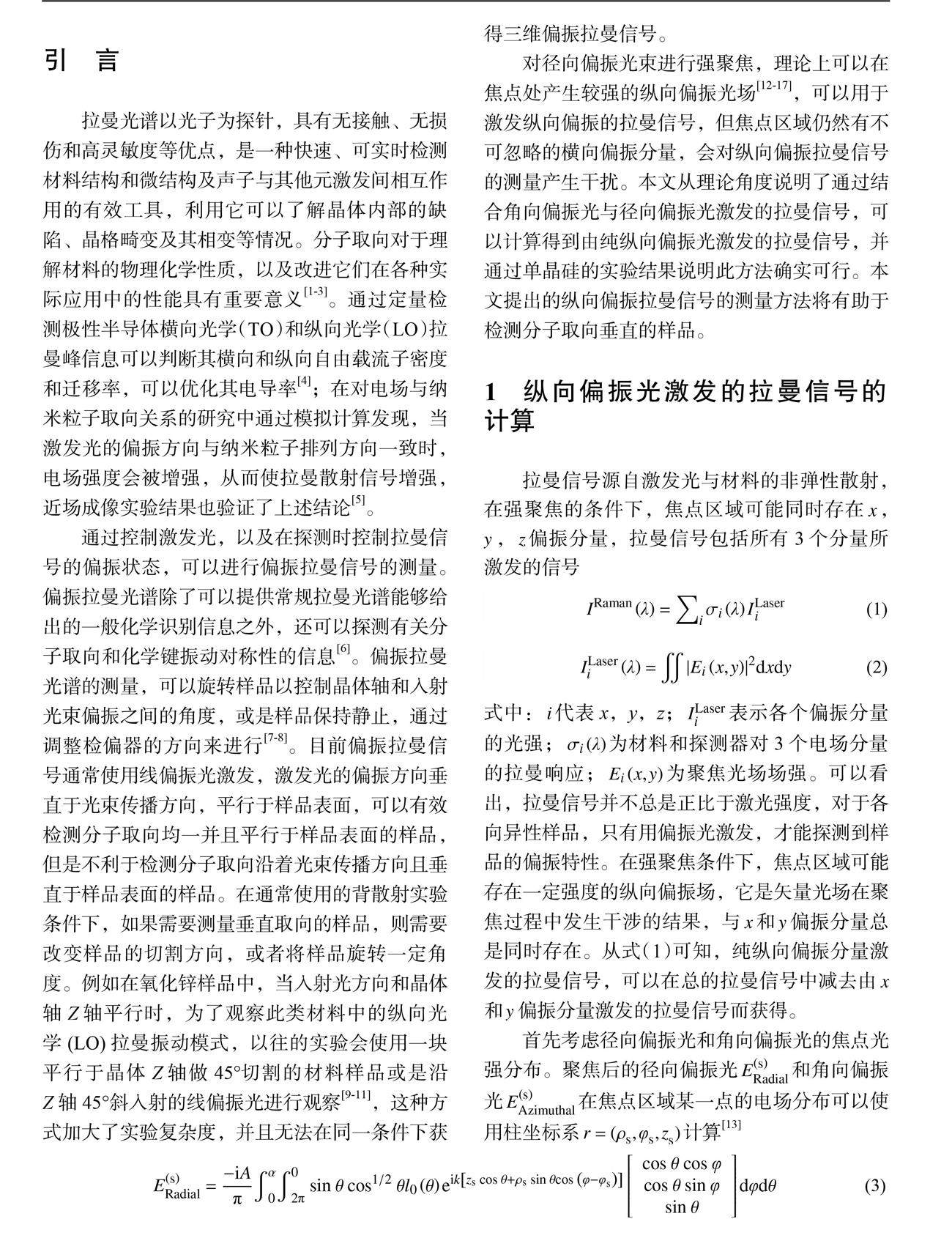 摘要:提出了一种获得径向偏振光中纵向分量激发拉曼信号的方法,用于解决一般偏振拉曼信号无法检测分子取向垂直于样品的问题。首先使用聚焦后的角向偏振光和径向偏振光激发样品,然后用两种激发光产生的拉曼信号进行计算,得到由纯纵向光场激发的拉曼信号。使用 Si(001)样品和 Si(110)样品验证了该方法的可行性。(剩余8918字)