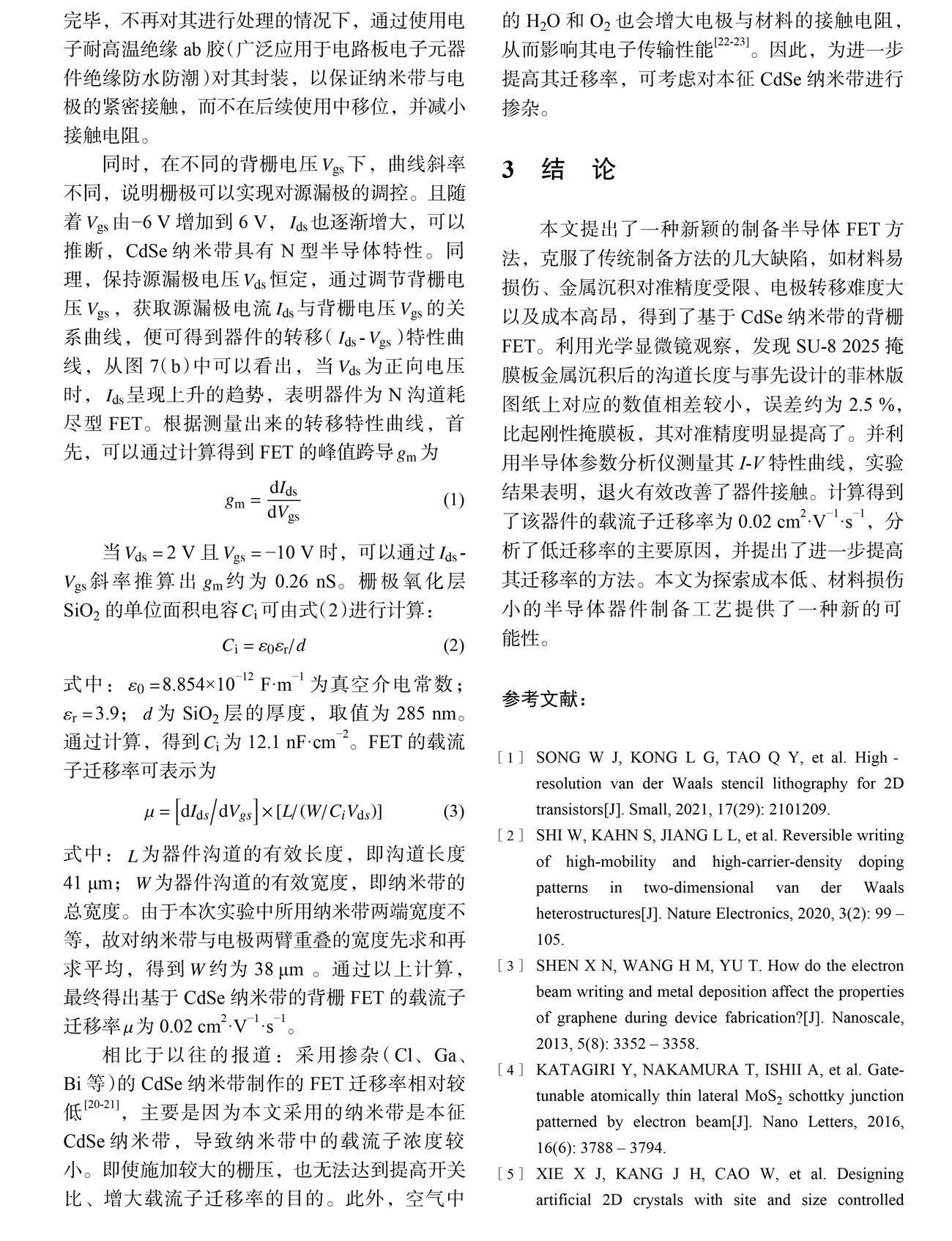 摘要:为克服传统制备半导体场效应晶体管(FET )过程中存在的材料损伤、对准精度受限、电极转移难度大和成本高昂等缺陷,提出了一种基于柔性掩膜技术的半导体 FET 制备方法。利用紫外光刻技术制作柔性掩膜板,直接捞取并加热蒸干固定掩膜板,采用离子束溅射法沉积金属,并通过将半导体 CdSe 纳米带转移到电极上,获得了N 沟道耗尽型 FET ,证实了器件的功能性和此方法的可行性。(剩余9929字)
