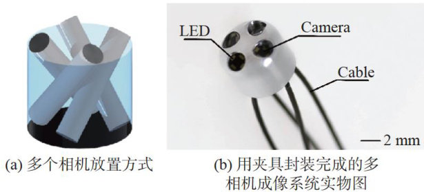 Abstract: Endoscopes are essential imaging devices that can access to narrow space for examination. However, the endoscope usually has a small angle of view and cannot observe the objects on the sides. In this paper, we proposed a multi-camera based large angle-of-view imaging technique.We derived a theoretical model for the large angle-of-view imaging technology based on multi-camera to analyze the relation between the structure and the angle of view. Then,by analyzing the impact of each parameter factor in the theoretical model on the final imaging effect, using theoretical derivation, and correcting the model parameters through experimental data, a multi-camera large angle-of-view imaging system with a diameter of 5.8mm consisting of four micro cameras was developed. The LED of the imaging technique can illumine the surroundings and detect the images with a wide angle of view exceeding 180∘ . At the same time, this technology realizes multi-camera imaging with a large field-of-view and automatic generation of panoramic images by image stitching through four images captured by the imaging system. We believe that large view-of-angle imaging technology based on multi-camera will provide better solutions for various fields such as surgery, industrial inspection and monitoring that require large field-of-view and panoramic imaging.