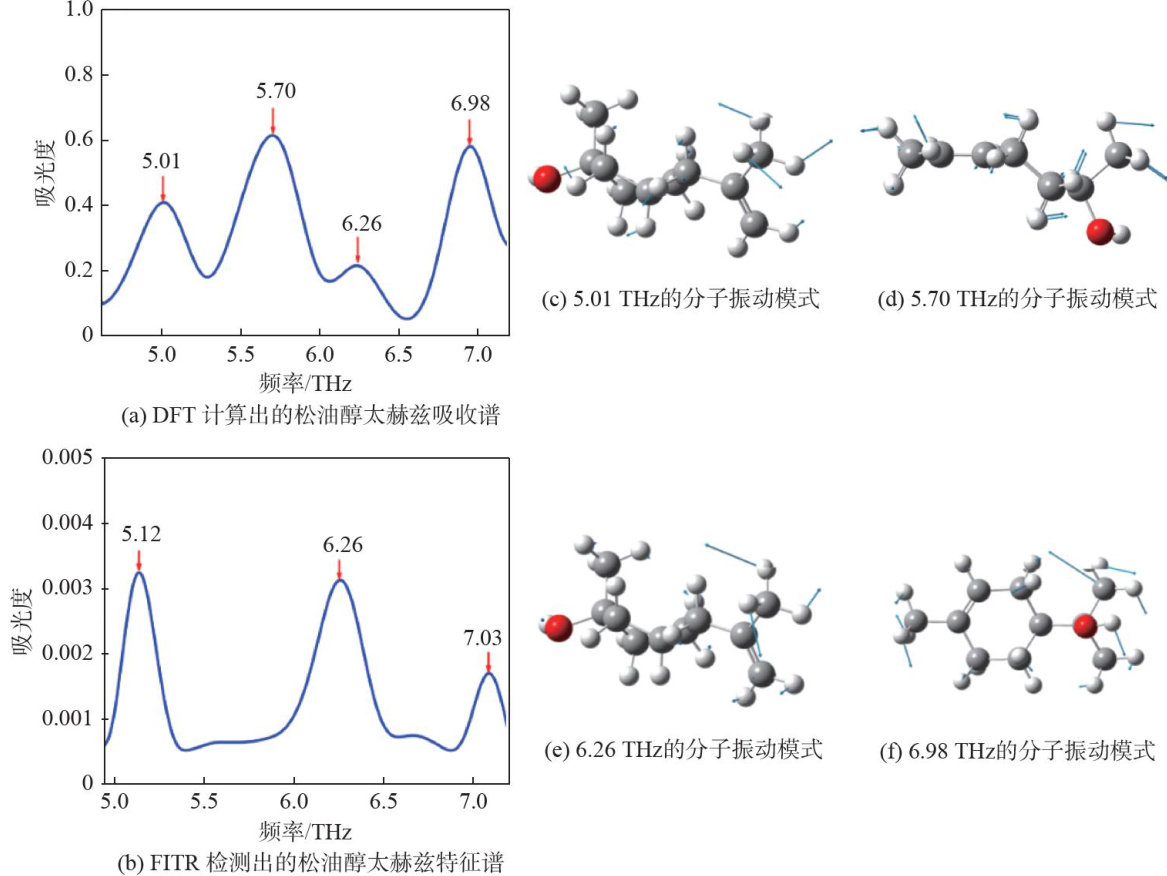 Abstract: Moxa wool, renowned as a treasure trove of traditional Chinese medicine, harbors pharmacologically active constituents including terpineol, flavonoids, and terpenoids,among which terpineol exhibits notable anti-inflammatory and analgesic properties. Conventional chemical methodologies encounter technical challenges such as complex sample preparation, time-consuming analysis, and high costs in determining the content of terpineol in moxa wool. Instead, the use of terahertz spectroscopy for rapid and non-destructive detection of terpineol in moxa wool not only improves detection eficiency,but also offers advantages such as high sensitivity and simple operation.By comparing the characteristic peaks in terahertz spectra with the vibrational modes obtained from molecular simulations, qualitative detection of terpineol in moxa wool was achieved through "spectral fingerprints". Quantitative detection was accomplished through the peak area of characteristic peaks. After linear fitting using partial least squares (PLS) regression, the correlation coefficient between the predicted and actual terpineol contents reached 0.99. The research establishes a novel approach for quality authentication of moxa wool and offering fresh perspectives for quality assessment in traditional Chinese medicine.