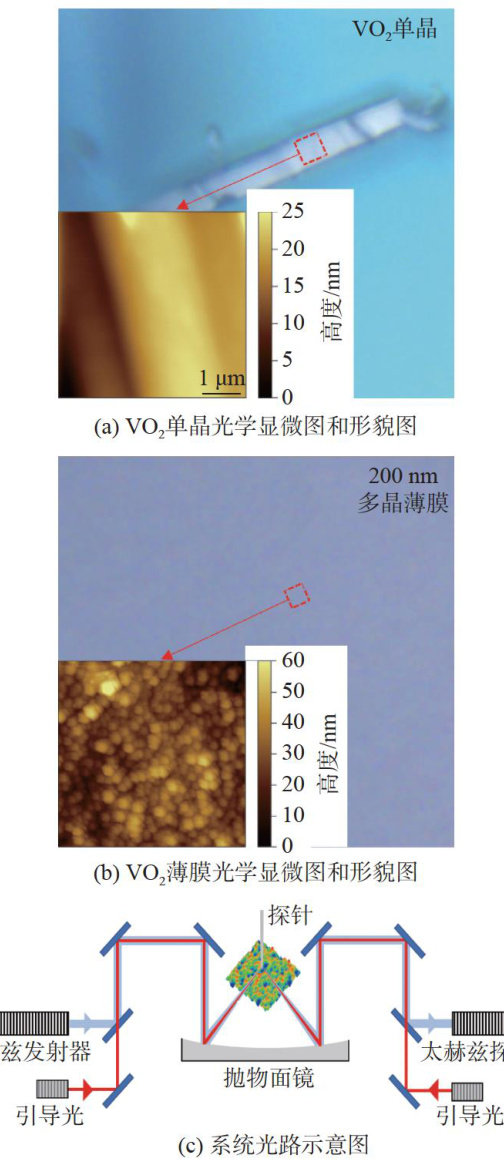 Abstract: The thermoinduced phase transformation process of vanadium dioxide (VO2) single crystal micron rods and polycrystalline films was characterized and analyzed by terahertz scatering-type scanning near-field optical microscopy (THz s-SNOM).During the heating process, the near-field signal of VO2 single crystal changed abruptly at 344.9K, which was due to the orderliness of the internal structure of the single crystal, which enabled it to rapidly change from monoclinic structure to tetragonal rutile structure, showing rapid and uniform phase transition. While the VO2 polycrystalline film exhibited the phenomenon of nucleated nanoisland growth and interconnection during the phase transition, which was due to the existence of defects such as grain boundaries in the VO2 polycrystalline film, resulting in non-uniform phase transition. The results show that the THz s-SNOM system has the ability to sensitively detect the relative change of conductivity of materials at the nanoscale,and is a powerful tool for microscopic characterization and analysis of the phase transformation process.