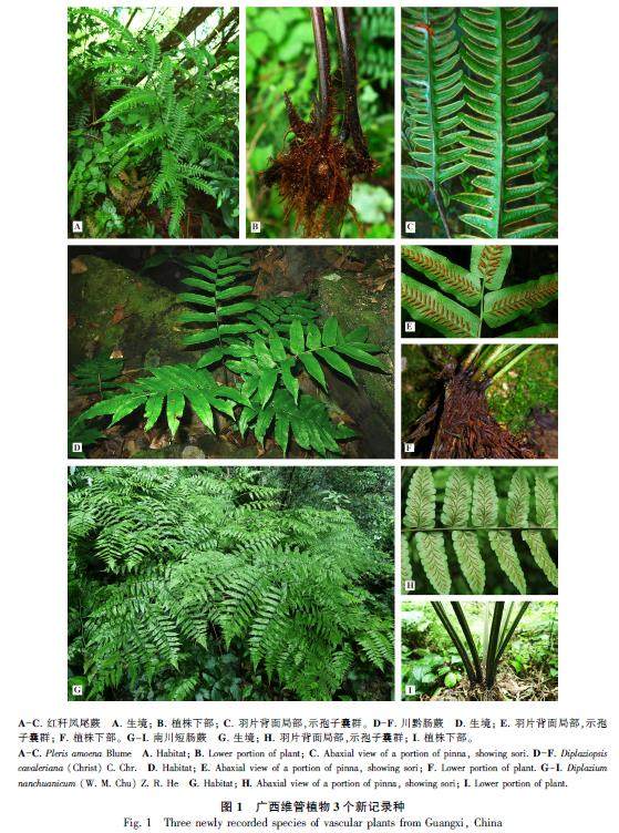 摘 要: 该文报道了广西西北部维管植物11个新记录种,即红秆凤尾蕨(Pteris amoena Blume)、川黔肠蕨 [Diplaziopsis cavaleriana (Christ) C. Chr.]、南川短肠蕨 [Diplazium nanchuanicum (W. M. Chu) Z. R. He]、树形针毛蕨 [Macrothelypteris ornata (Wall. ex J. Sm.) Ching]、秦氏贯众(Cyrtomium chingianum P. S. Wang)、邢氏贯众(C. shingianum H. S. Kung & P. S. Wang)、变叶锥 [Castanopsis diversifolia (Kurz) King ex Hook. f.]、粗穗柯 [Lithocarpus elegans (Blume) Hatus. ex Soepadmo]、镰叶茜草(Rubia falciformis H. S. Lo)、高艾纳香 [Blumea repanda (Roxb.) Hand.-Mazz.]、腺毛合耳菊 [Synotis saluenensis (Diels) C. Jeffrey & Y. L. Chen],这些新记录种的发现不仅为广西植物区系地理研究提供了新资料,而且还对植物资源的创新利用及植物多样性的保护等具有重大意义。(剩余18786字)