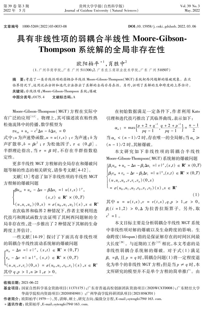 关键词:非线性项;Moore-Gibson-Thompson系统;爆破