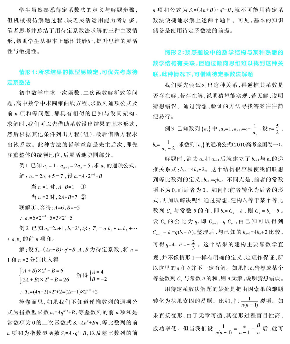 学生虽然熟悉待定系数法的定义与解题步骤,但机械模仿解题过程、缺乏灵活运用能力者居多。笔者思考并总结了用待定系数法求解的三种主要情形,帮助学生从根本上感悟其妙处,提升思维的灵活性与敏捷性。