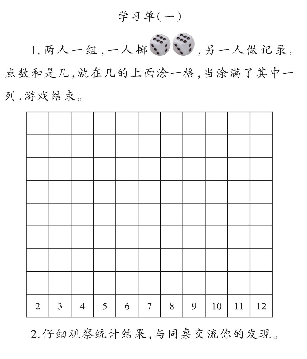 人教版五年级数学《掷一掷》是“综合与实践”领域的内容。笔者基于游戏活动设计了两份学习单,引导学生以学习单为支架,边做游戏边记录、思考游戏结果,逐步发现游戏背后蕴含的数学道理,进而理解概率知识、强化数据意识、积累活动经验。