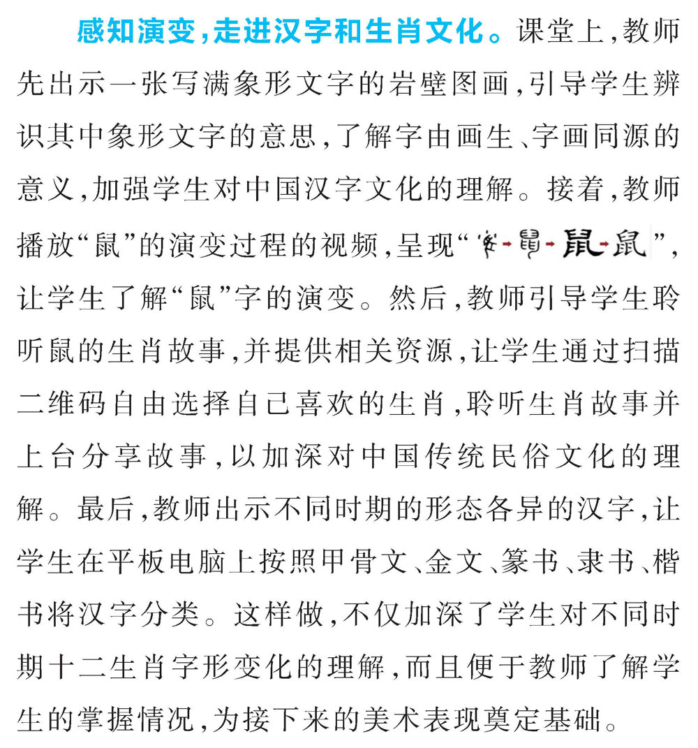 “汉字成画——十二生肖”是根据人美版美术第八册《汉字的联想》设计的一节拓展课,它属于“造型·表现”领域课程。教师在指导学生了解有关十二生肖文化内涵的基础上,引导他们收集、阅读相关资料,思考和讨论,加深对十二生肖“字义”和“形意”的理解,并结合十二生肖的图像与不同时期的文字构形进行大胆联想,借助传统与现代媒材和技术,通过观察、想象、构思和表现等过程,创造有意味的美术作品,探寻十二生肖里的汉字文化。(剩余1153字)