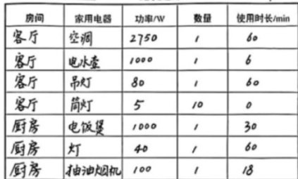 为了解家中用电情况并提出安全用电、节约用电的建议,某同学调查家庭电器用电情况,结果如下表所示,家庭电路电压为 220V(1) 求客厅空调正常工作时的电流。(2)求电水壶正常工作时的电阻。(3)表中的厨房电器在调查时段内总共消耗的电能为多少kW⋅h?(4) 该同学利用掌握的电学知识,积极参与街道安全用电、节约用电宣传工作,请帮他完成宣传栏中 ① 或 ② 的提示语(图略。(剩余4174字)