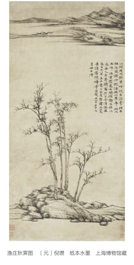 本幅作品出自“元四家”之一的倪瓒之手。倪瓒是“元四家”中最具性格特点的一位。据说,倪瓒性格孤僻狷狂,还有洁癖。他家本是大地主,因祖上善于积累而富有资财,但倪瓒却无心经营,终日与和尚、道士为伍,或者访友论画。元末社会动乱时,他甚至变卖了所有财产,遣散了所有仆人,四处游历,最后竟不知死于何处。倪瓒的绘画,是他强烈主观意兴的抒发,他反对刻意求工、求似,主张“逸笔草草”“聊以自娱”。(剩余206字)