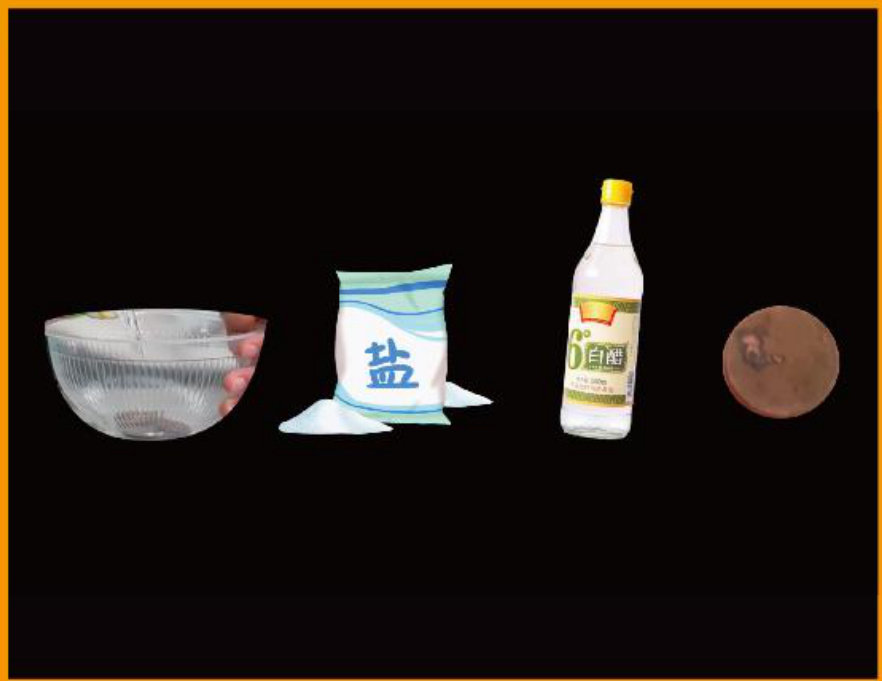 需要准备:铜制旧硬币、白醋、盐、碗
