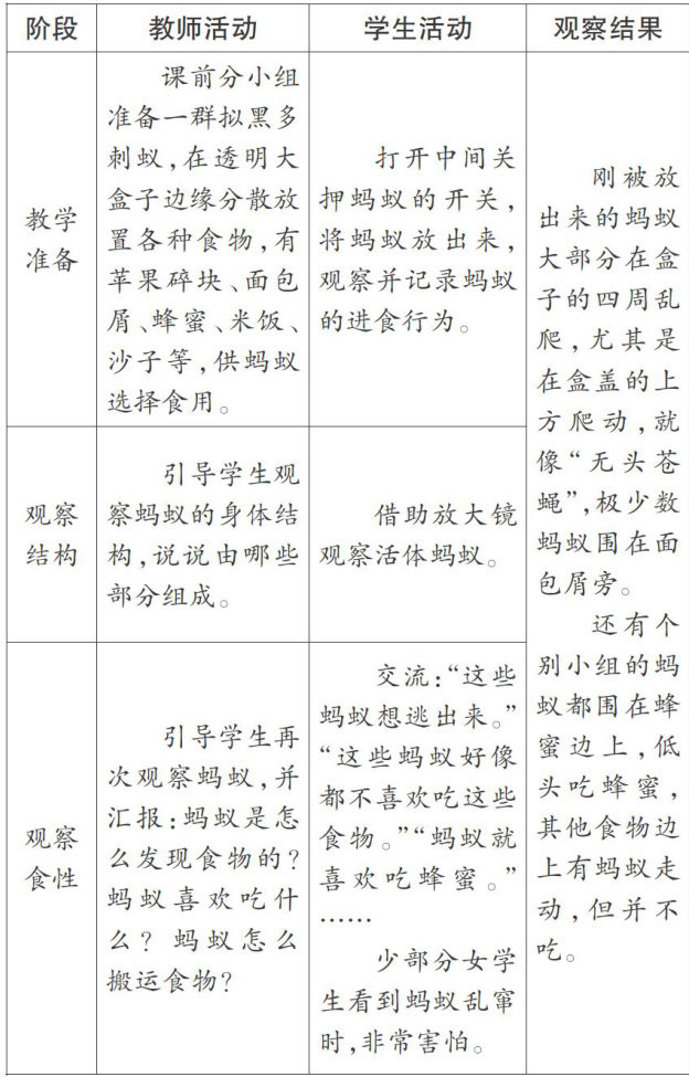 《它们吃什么》是一年级“常见的动物”单元中的内容。实际教学中,有的教师在课堂上让学生观察拟黑多刺蚁来学习,有的教师课前在校园里多处放各种食物,组织学生观察。这些做法虽为学生提供了观察条件,但也引发了听课教师对实验设计与生态伦理平衡的思考。如何在小学科学观察实验教学中有效融人生态伦理理念?