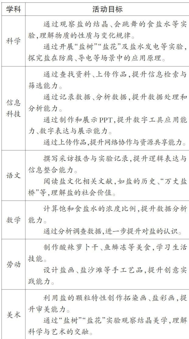 跨学科教学作为培养学生核心素养的重要渠道之一,能够通过主题式探究帮助学生实现知识的整合与应用。我们围绕“盐"这一生活化主题,融合科学、信息科技、语文、数学、劳动、美术等学科知识,引导学生开展一系列跨学科活动,培养他们的观察能力、创新思维及责任担当意识,为落实核心素养的培养要求提供实践参考。