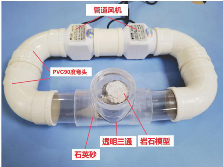 管道风机、透明三通、PVC管、岩 石模型(由石膏粉和灰色水粉画颜料 做成的)、白色石英砂等。