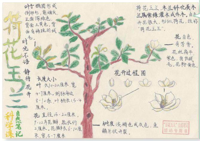 编辑手记小作者通过手绘的方式呈现荷花玉兰的整体形态、花朵开放过程,搭配文字说明,直观且富有吸引力。作品从形状、颜色、气味等方面对荷花玉兰的叶子、花、树皮等进行了详细描述,并运用了量化观察,能让读者清晰了解荷花玉兰各部分的特征,如叶子的正面呈深绿色,背面呈土黄色;花呈白色,有芳香;树皮呈淡褐色或灰色,鱼鳞片状开裂;等等。(剩余98字)