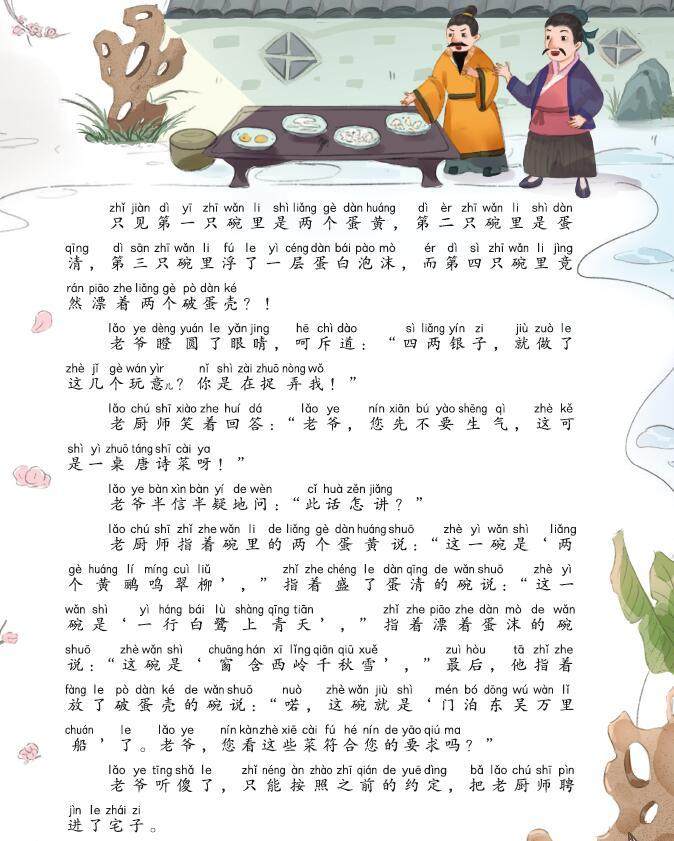 一天,这位老爷把家里的厨师辞退了,打算寻一位能用菜作诗的新厨师。于是,他命人在宅子外面贴了一张求贤榜 。 没 多久,一位老厨师就来揭榜了。