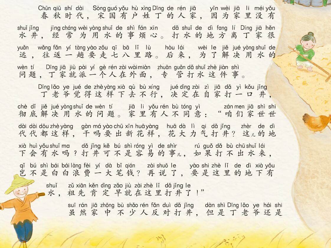 春秋时代,宋国有户姓丁的人家,因为家里没有水井,经常为用水的事烦心。打水的地方离丁家很远 ,往返一趟要走七八里路。后来,为了解决用水的问题, 丁家就派一个人在外面, 专 管打水 这 件 事。